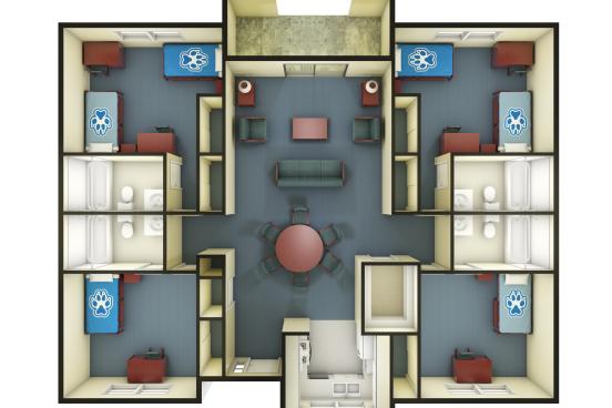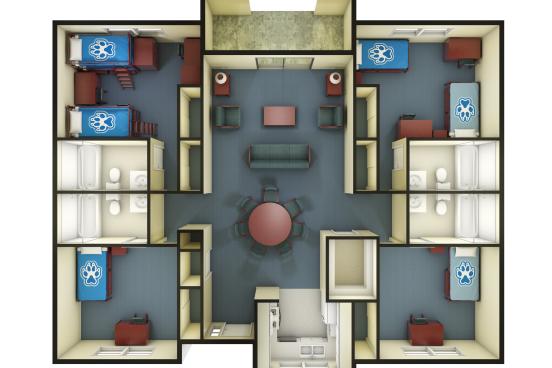 All apartments have four bedrooms. Floor plans can be either two single bedrooms and two double occupancy bedrooms with six people or two single bedrooms, one double bedroom, and one triple* occupancy bedroom with seven people. No matter which occupancy bedroom you are assigned to, each bedroom has its own private bathroom. There really is an option for all types of living!