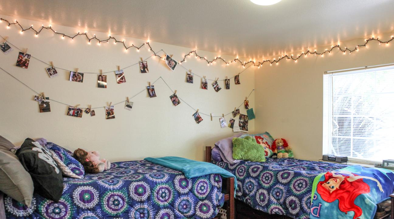 Each resident is supplied with an extra long twin size bed, desk, desk chair, clothes closet, and nightstand. Single rooms have a full bookcase and a three drawer dresser. The double occupancy bedrooms have 2 stackable dressers per resident which can fit underneath the beds. The triple occupancy bedrooms have one bunk bed and one lofted bed with desk. Each resident has a bed, desk, chair, dresser, and nightstand. Most mattresses are 80 inches long by 38 inches wide by 6 inches high. Bedrooms have an overhead fluorescent light, but no study lamps. All of the windows are covered by mini-blinds.